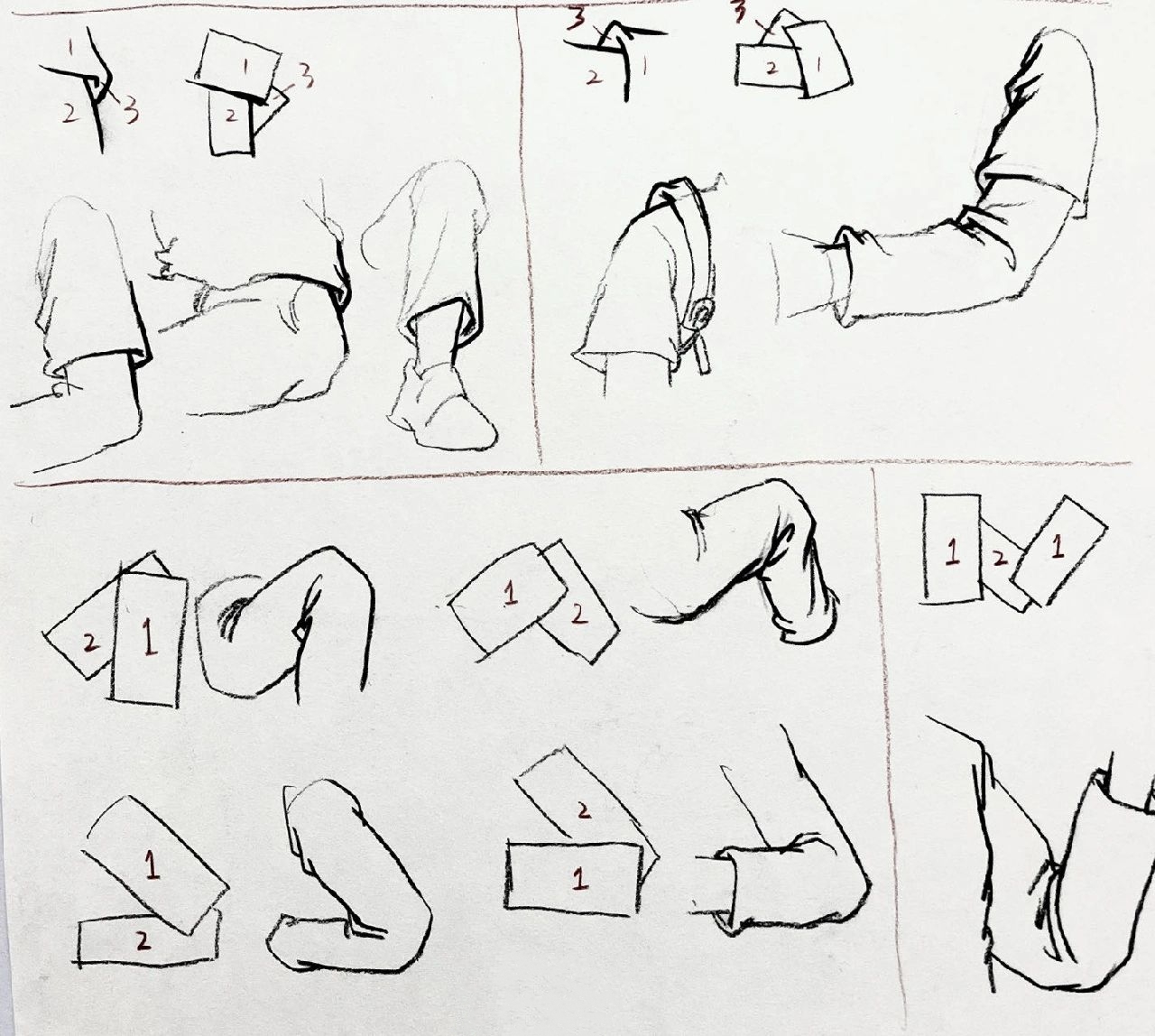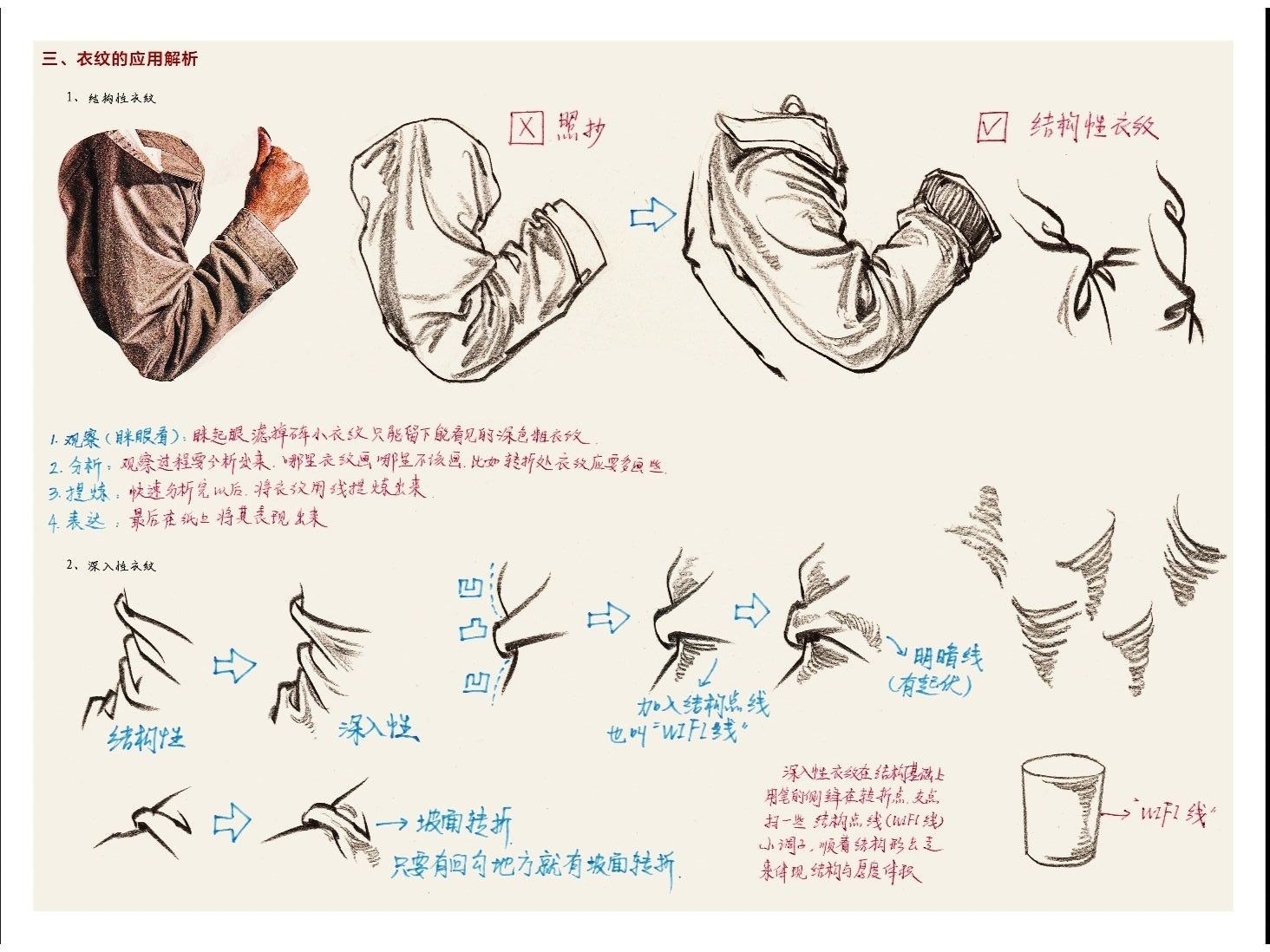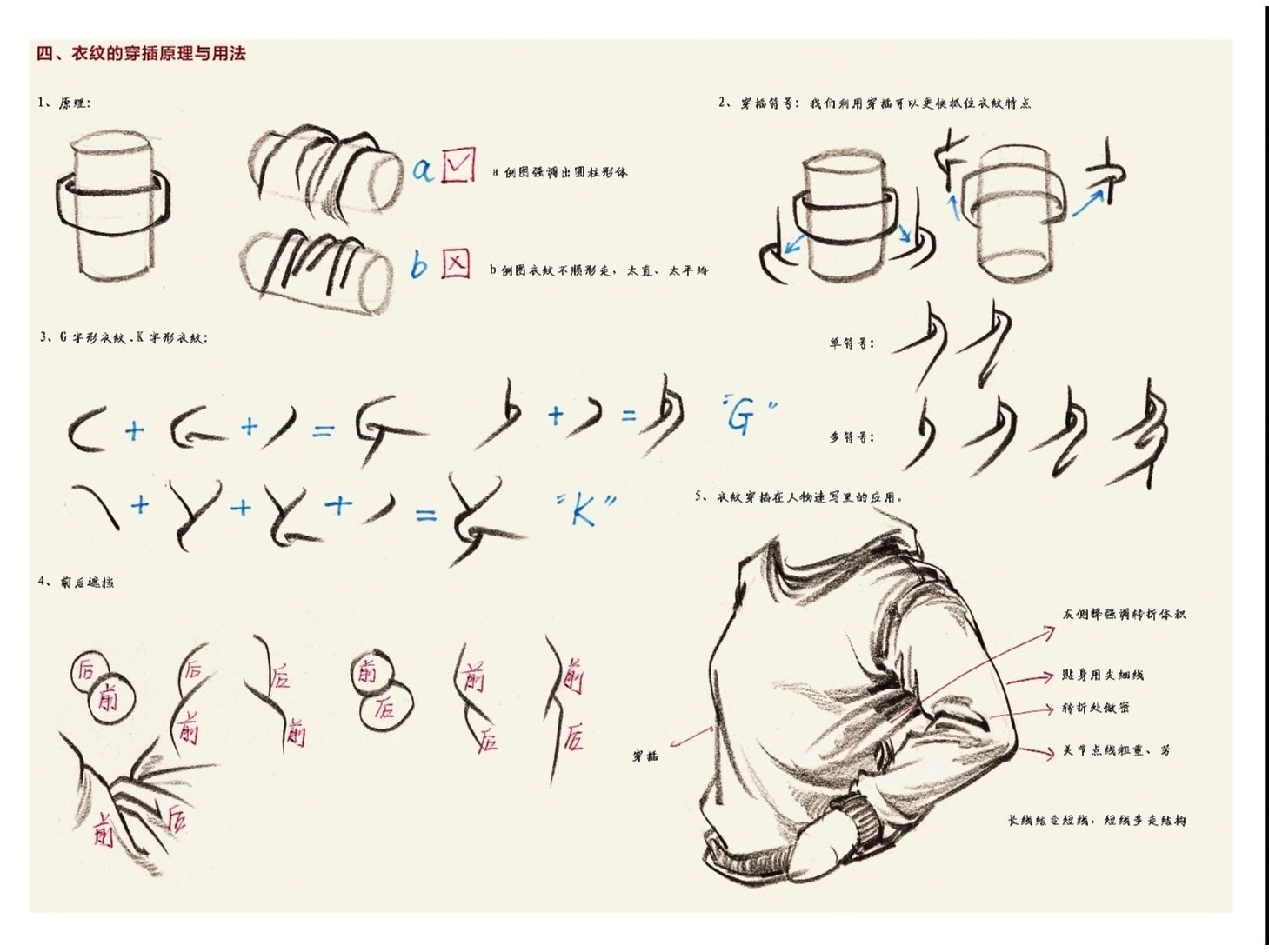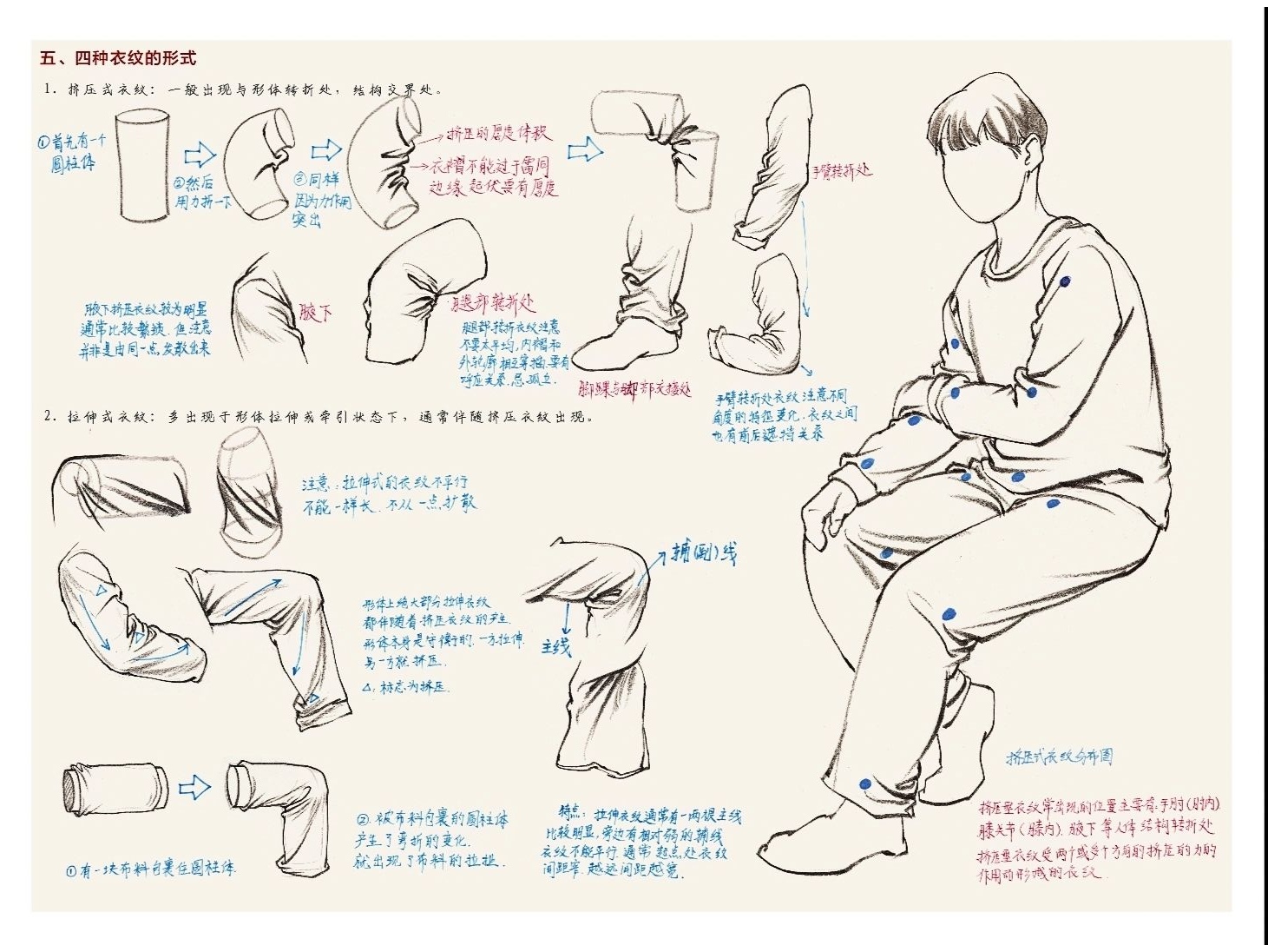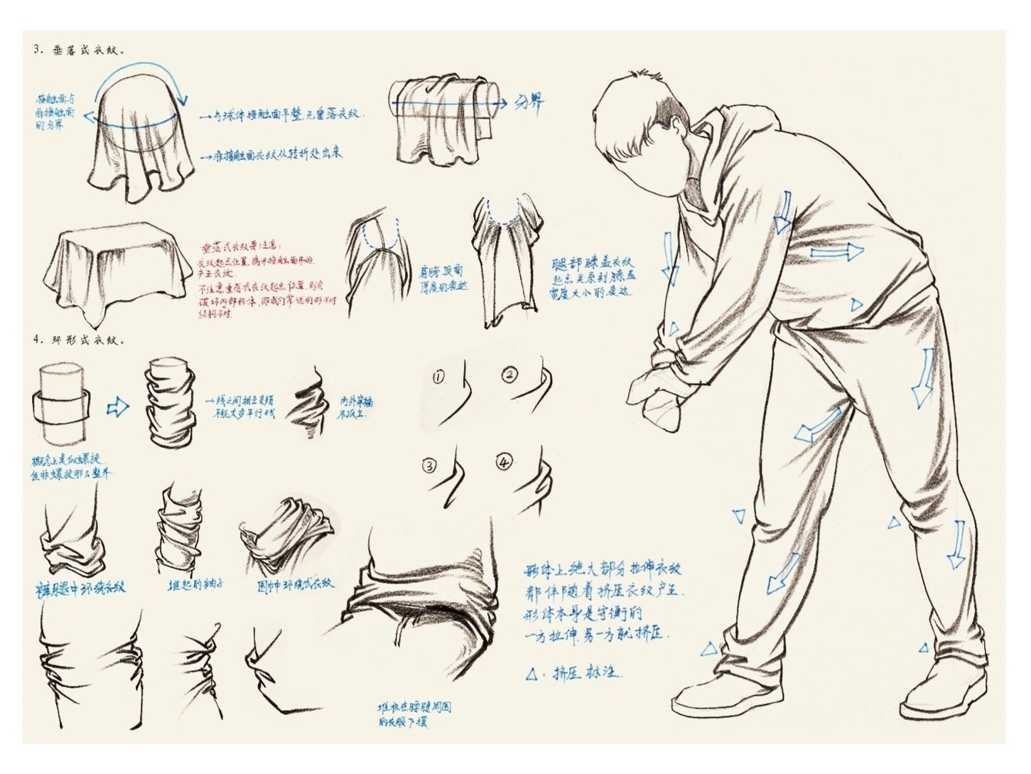 2.懸垂褶皺就是在畫素描的時候找兩個支點作為衣物的懸掛點,常見的褶皺膝蓋之間,肩膀之間,肩膀和伸出的手臂之間。