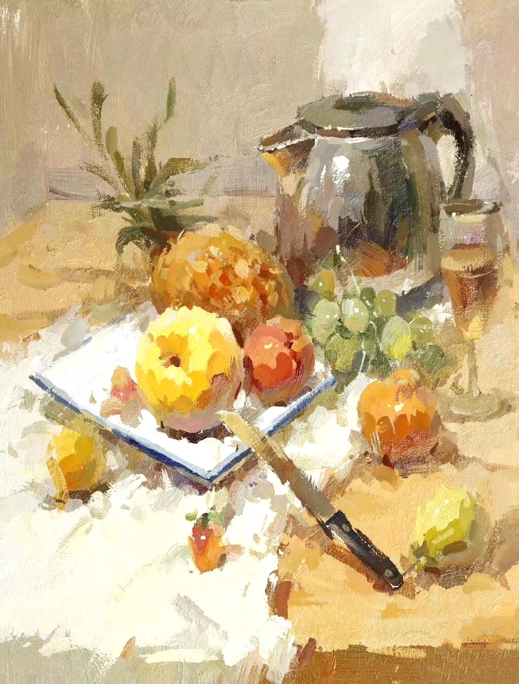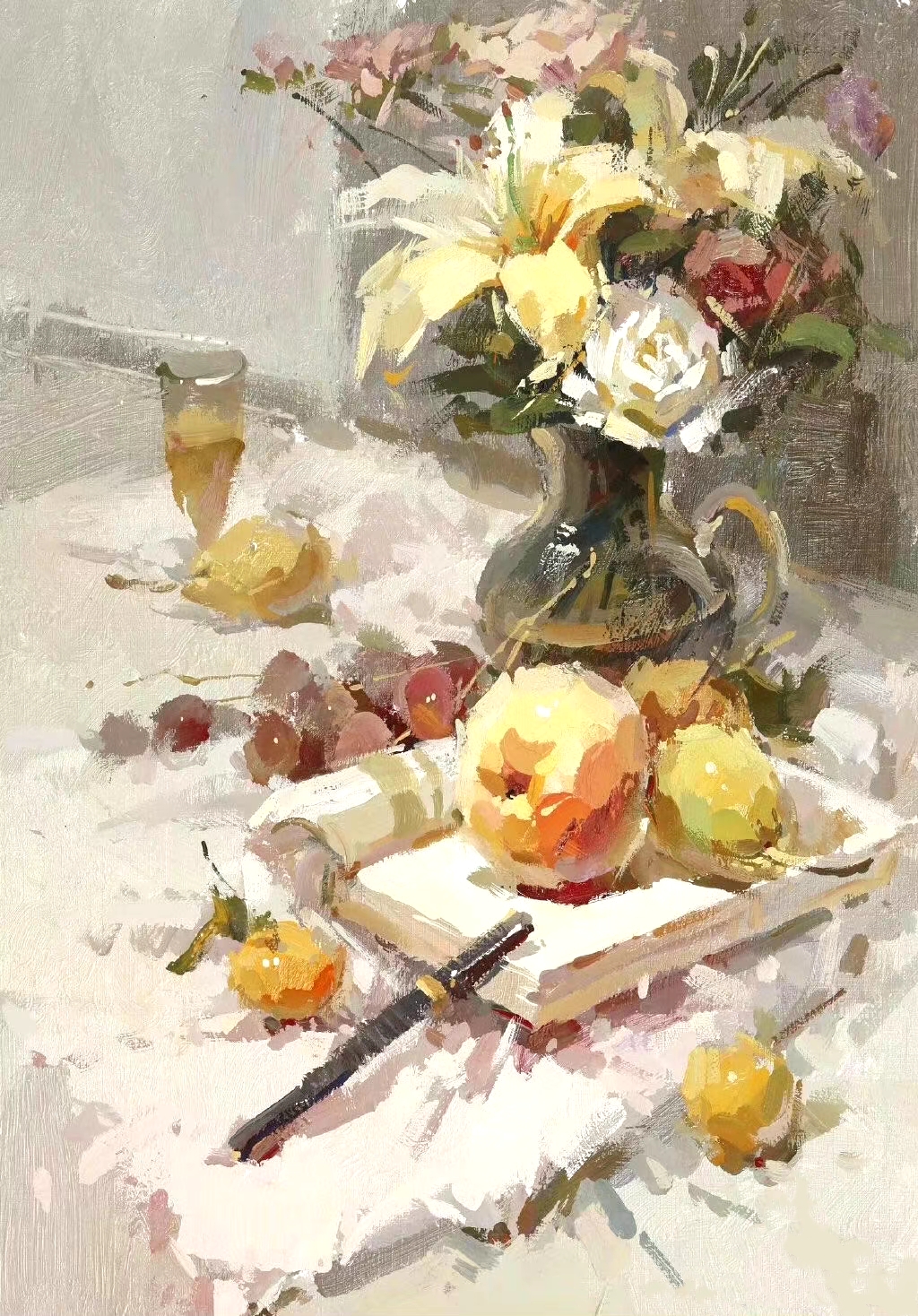 物體造型要結(jié)實(shí),外輪廓要虛實(shí)結(jié)合,掃出去的顏色力量要小一些,不要太大面積。鋪色時(shí)畫(huà)好固有色和環(huán)境色,豐富反光的環(huán)境色要添加少許冷色掃上去。重的地方要卡一卡,要自然一些,不要太跳了。